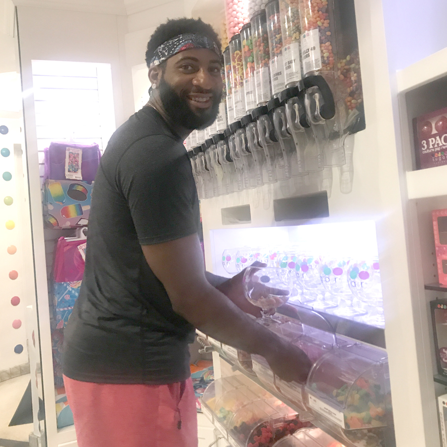 After dinner Andre went straight for the candy shop where he went big boy style instead of a regular candy pail the 7 foot tall center filled a whole goblet with candy, his favorites where the sour section where he grabbed sour water melons, sour belts and sour patch kids.