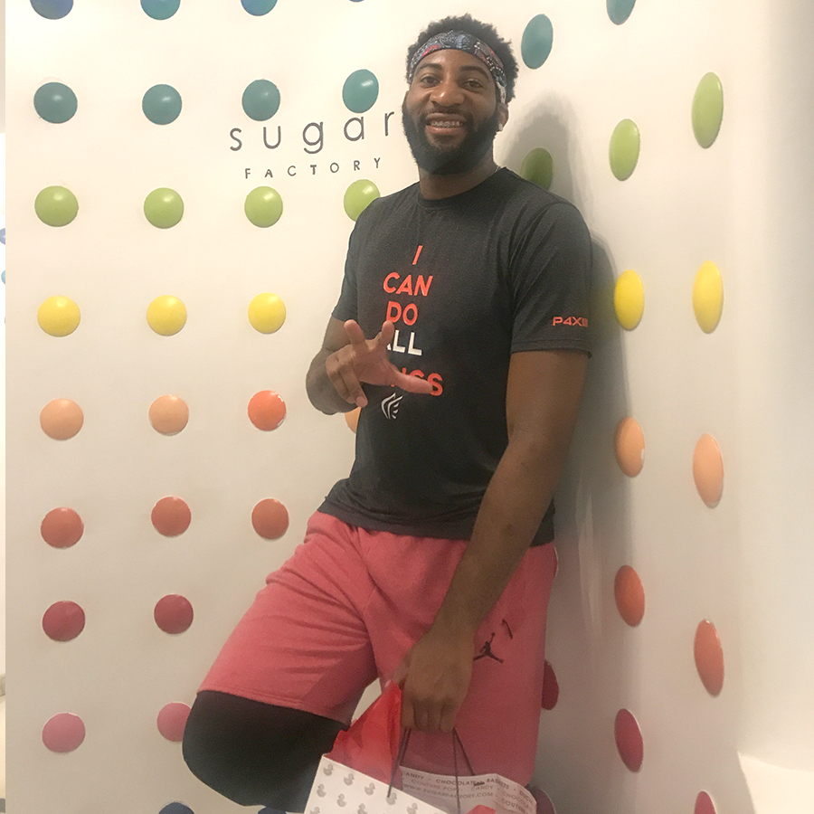 Andre sat inside close to the candy shop with his brother and assistant manager, to start they ordered our Calamari Fritti, Buffalo Chicken Wings and our Signature Mac and Cheese pops. The group was on a very friendly mood chatting and taking pictures with fans. For entrée Andre went all out with our Seafood mix grill, his manager had a traditional Caesar Salad with shrimp and chicken while his brother ordered a Pacific Salmon.