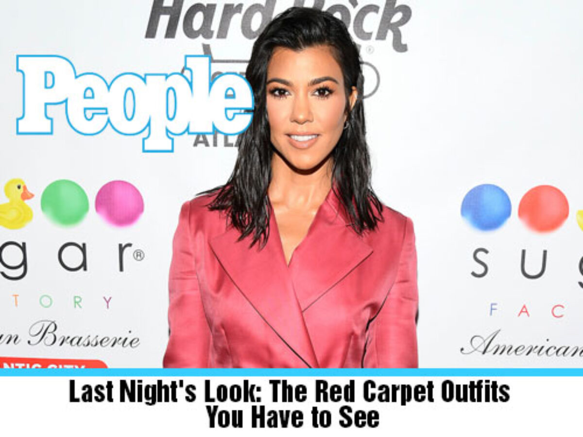 Kourtney Kardashian in a pink double-breasted long-sleeve Marina Moscone jacket at the grand opening of Sugar Factory at Hard Rock Hotel & Casino in Atlantic City.