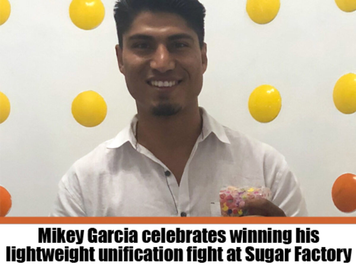 Mikey Garcia celebrates winning his lightweight unification fight at Sugar Factory.